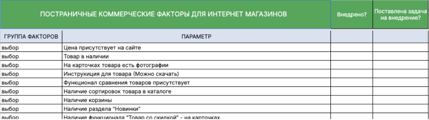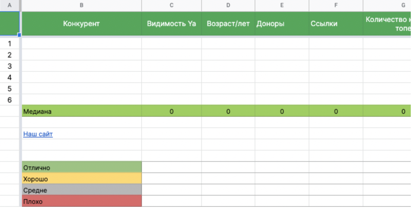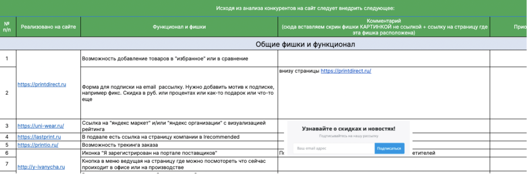 1. Провели анализ ниши. Аудит конкурентов. Аудит содержания конкурентов (скрин приведен для примера наших внутренних рабочих таблиц)