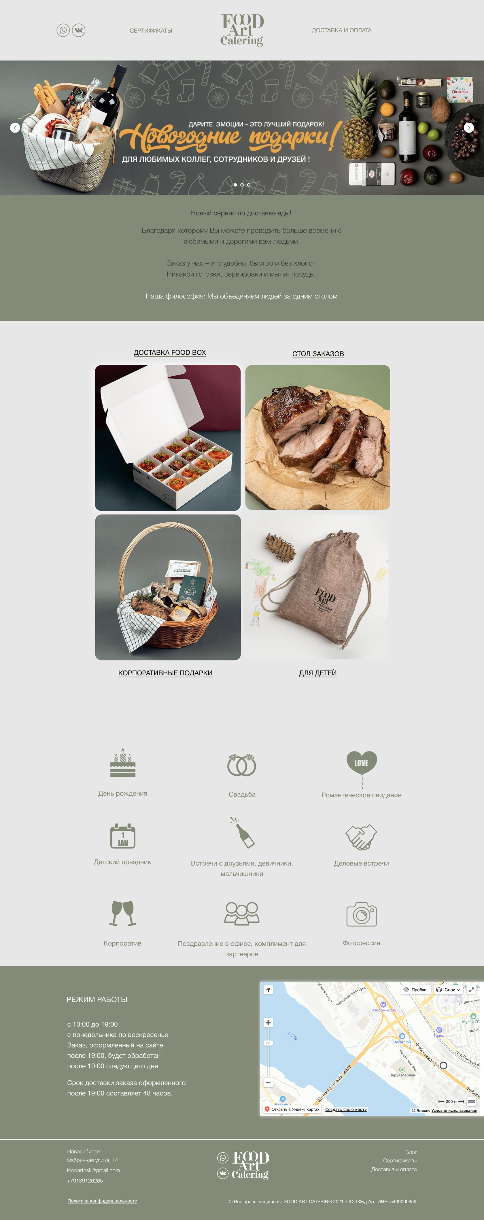 Food Art Delivery - интернет-магазин для продажи готовых наборов с едой, закусками, продуктов, корпоративных подарков. Позволяет сэкономить время на готовку еды, а также заказать охлаждённые части блюд для приготовления.